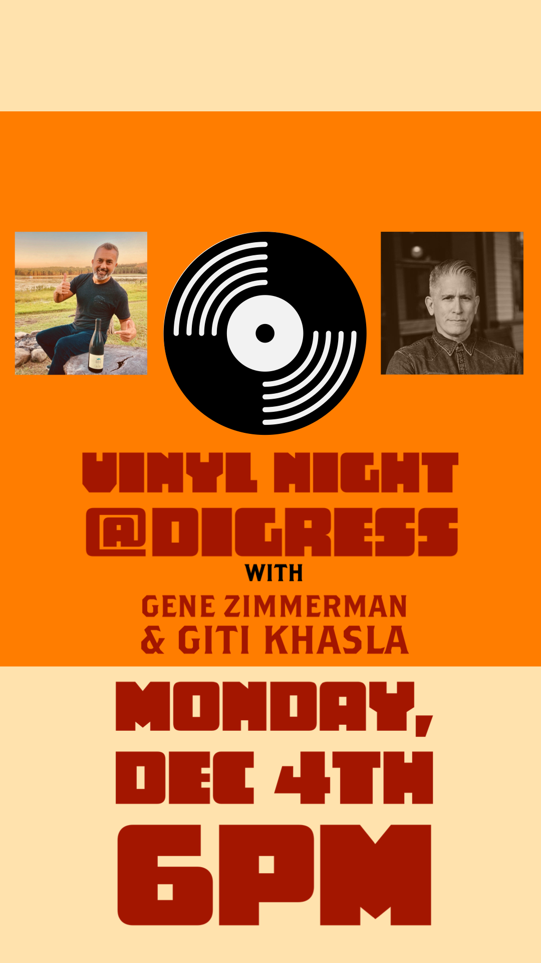 Our good homies and local legends Gene Zimmerman & Giti Khalsa will be flipping tracks beginning at 6pm, and if you know these cats….then you know good taste abounds. Whether you're a seasoned audiophile or just looking to discover the magic of analog sound, Digress is the place to be on Monday night for good vibes and good friends!