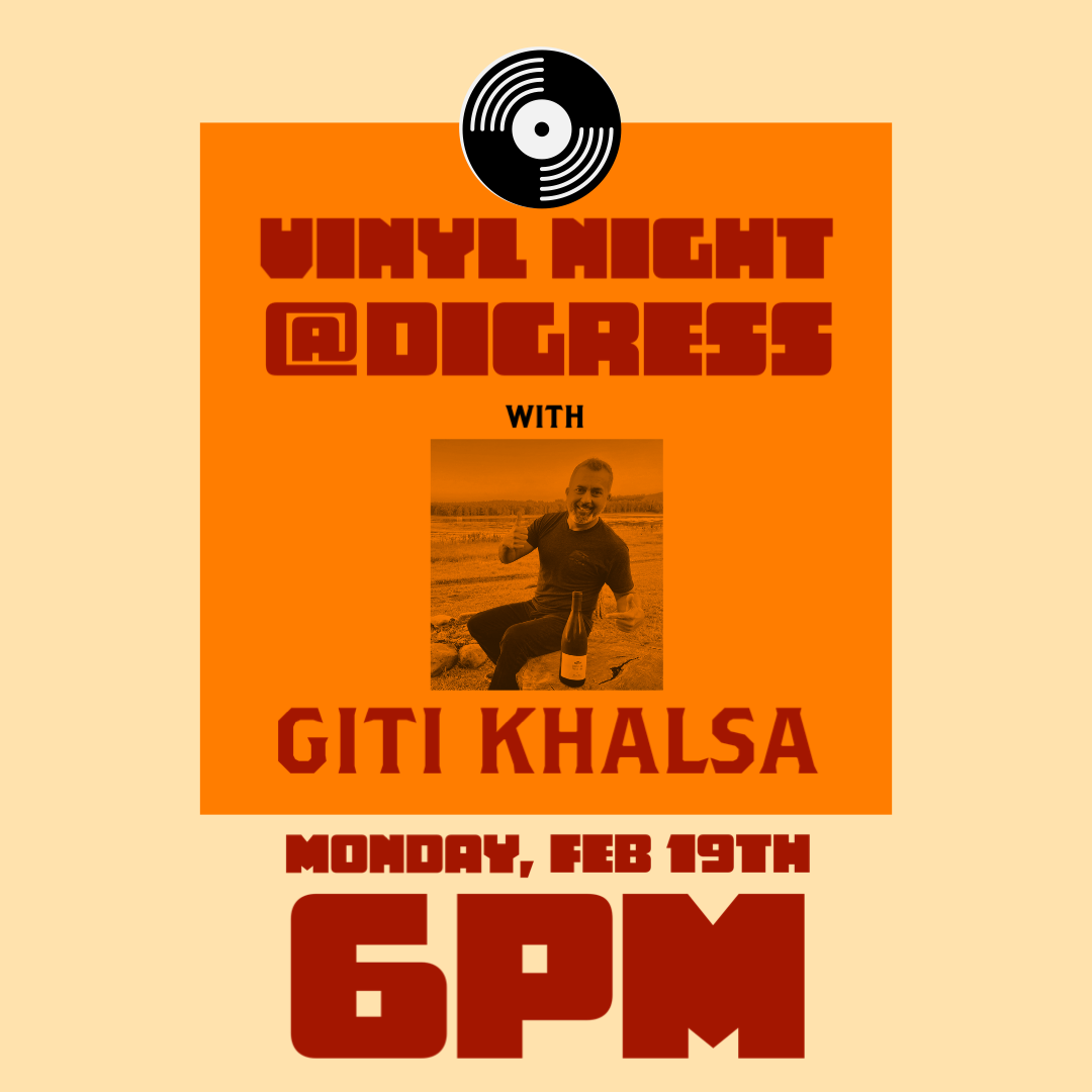 Our homie and local legend Giti Khalsa will be flipping tracks beginning at 6pm, and if you know this cat….then you know good taste abounds. Whether you're a seasoned audiophile or just looking to discover the magic of analog sound, Digress is the place to be on Monday night for good vibes and good friends!